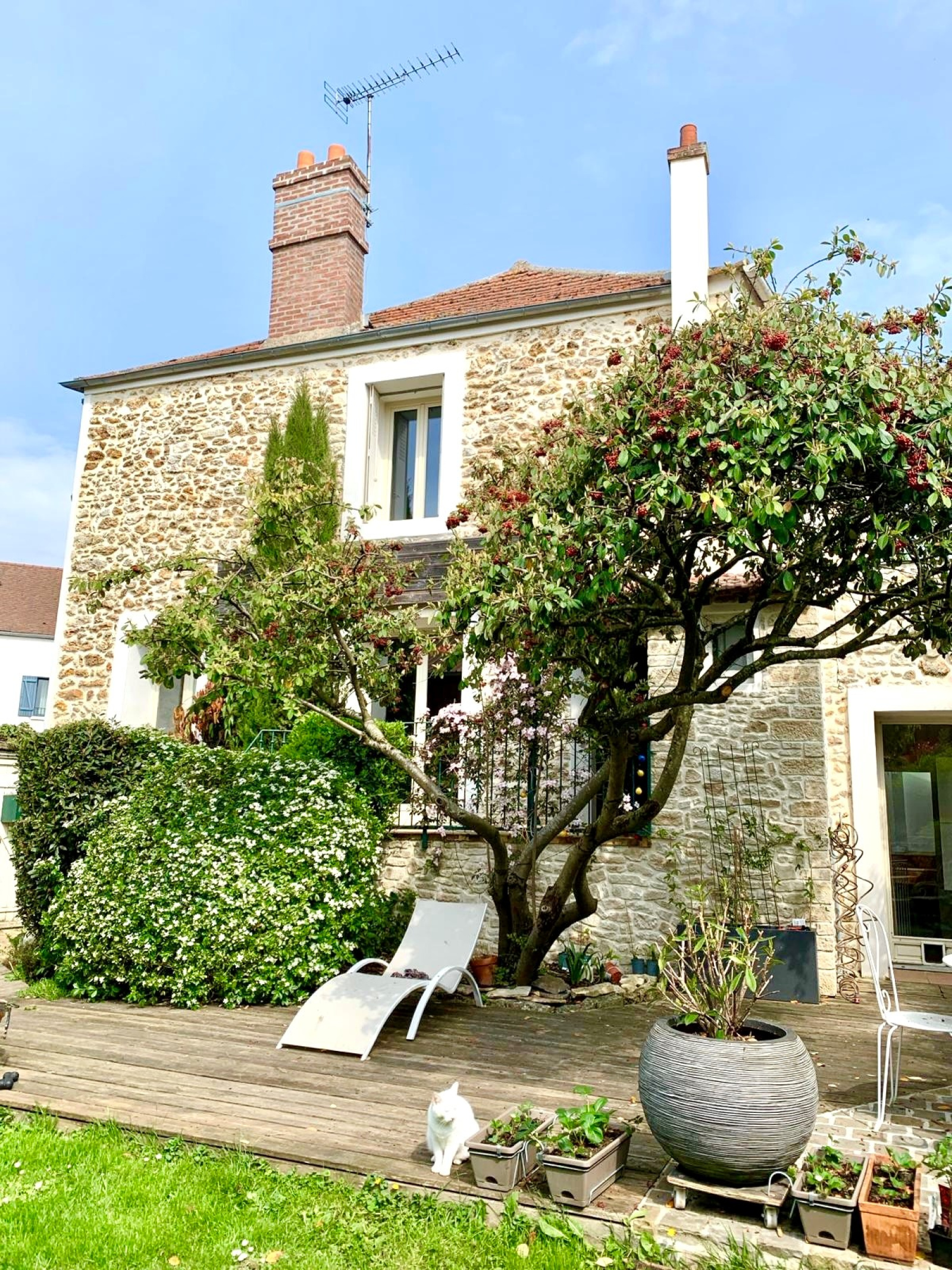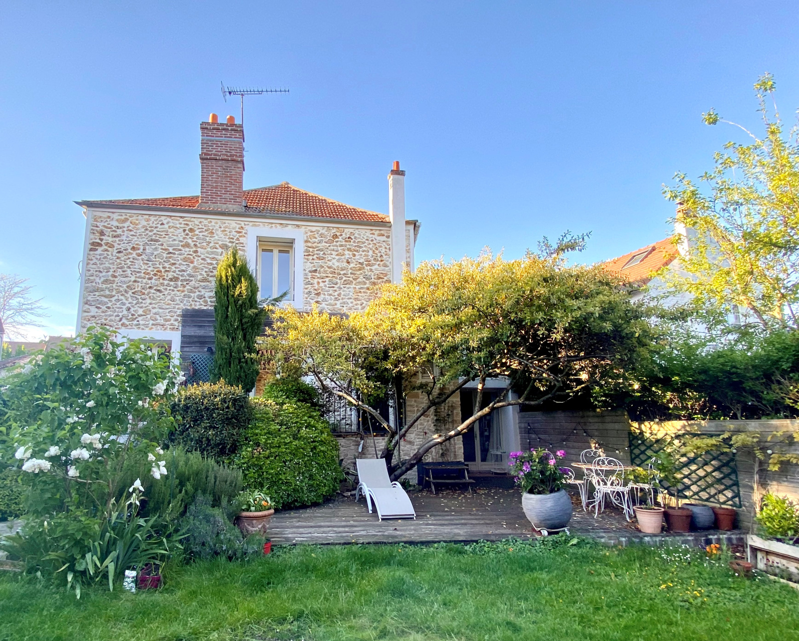 Centre ville de Crespières. Maison de charme proposant un jardin paysagé avec un abri de jardin totalement clos et une terrasse de 30 m².