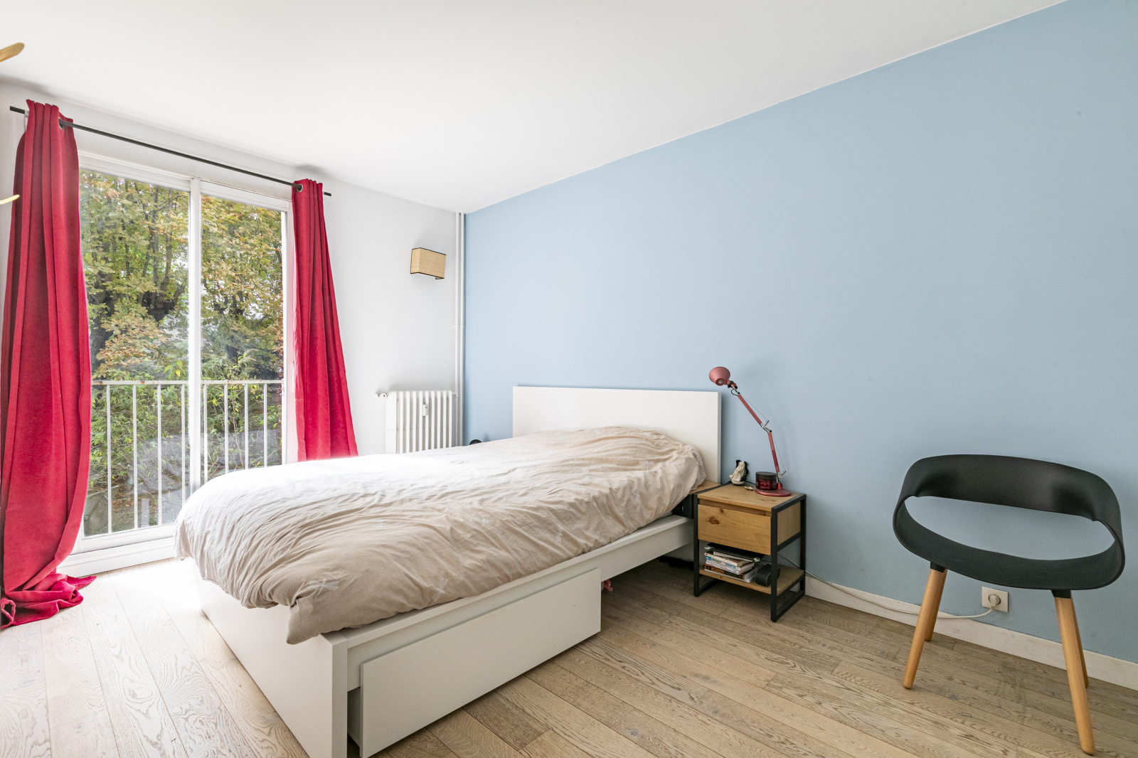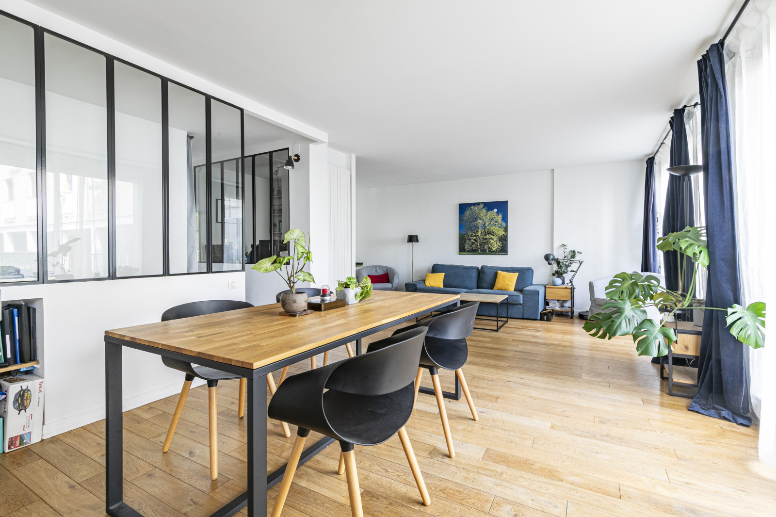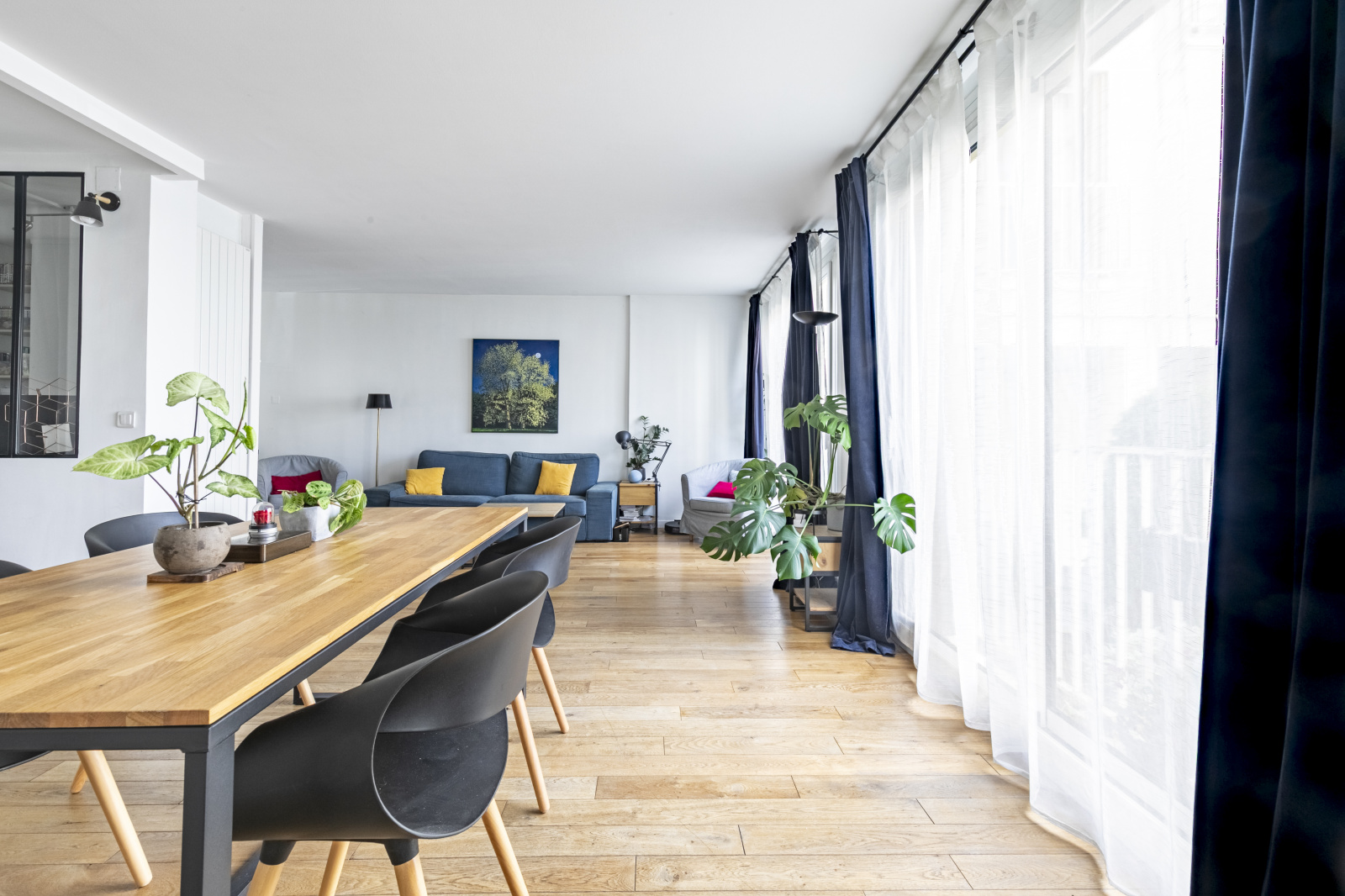Une entrée, un agréable double séjour grâce à ses grandes baies vitrées, une cuisine ouverte, aménagée et équipée ainsi qu’un espace bureau. Un dégagement avec rangement mène vers le coin nuit composé de deux belles chambres avec placards donnant sur le jardin de la copropriété, au calme absolu, une salle de bains et des WC séparés.