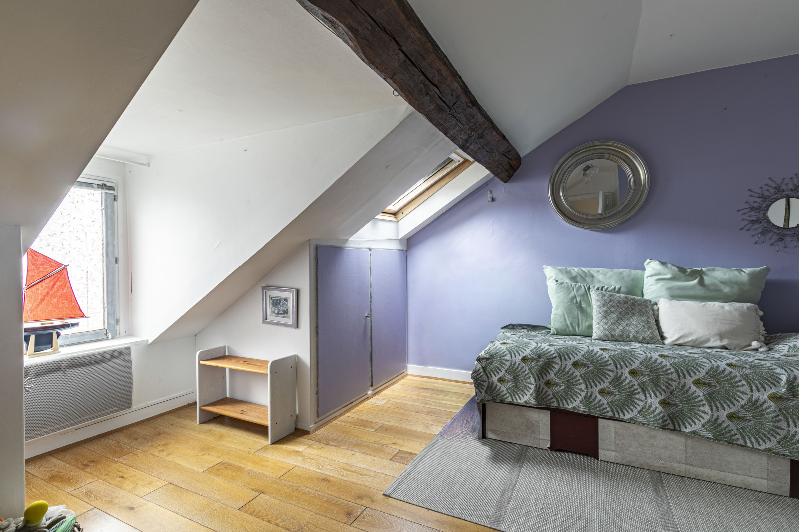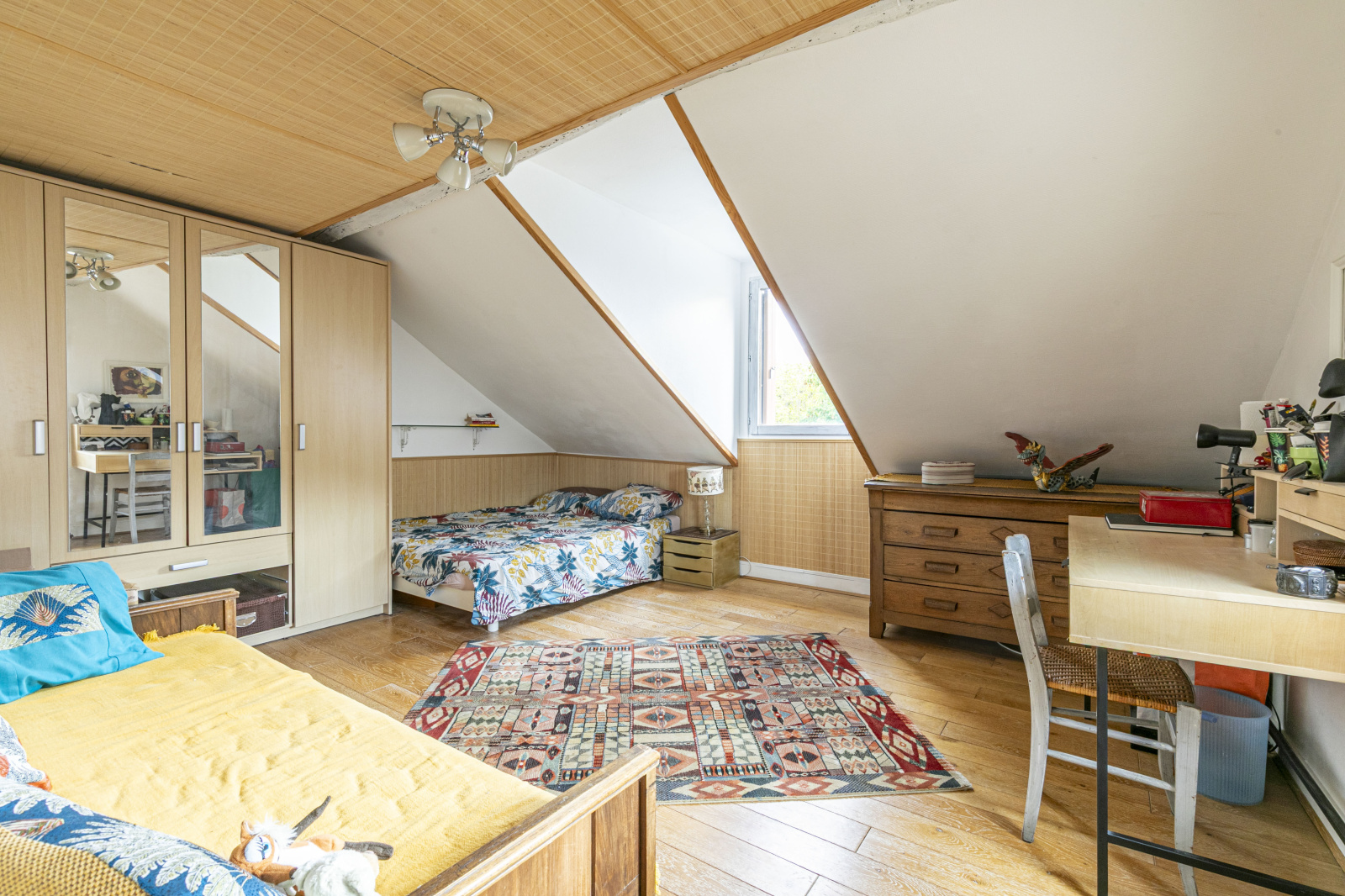 À l’étage, deux chambres, une salle de bains et un grenier viennent compléter l’espace nuit, offrant une distribution fonctionnelle et de belles perspectives d’aménagement.